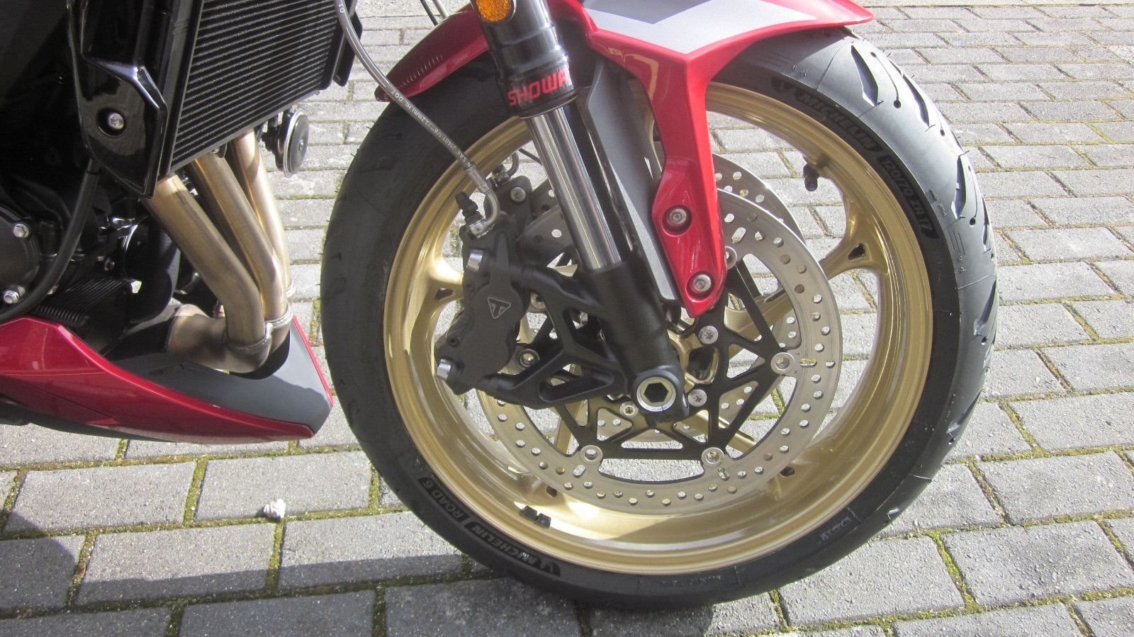 Vorderradaufhängung: Showa 41 mm Upside-Down-BP-SFF-Gabel mit einstellbarer Druck- und Zugstufendämpfung, 120 mm Federweg am Vorderrad